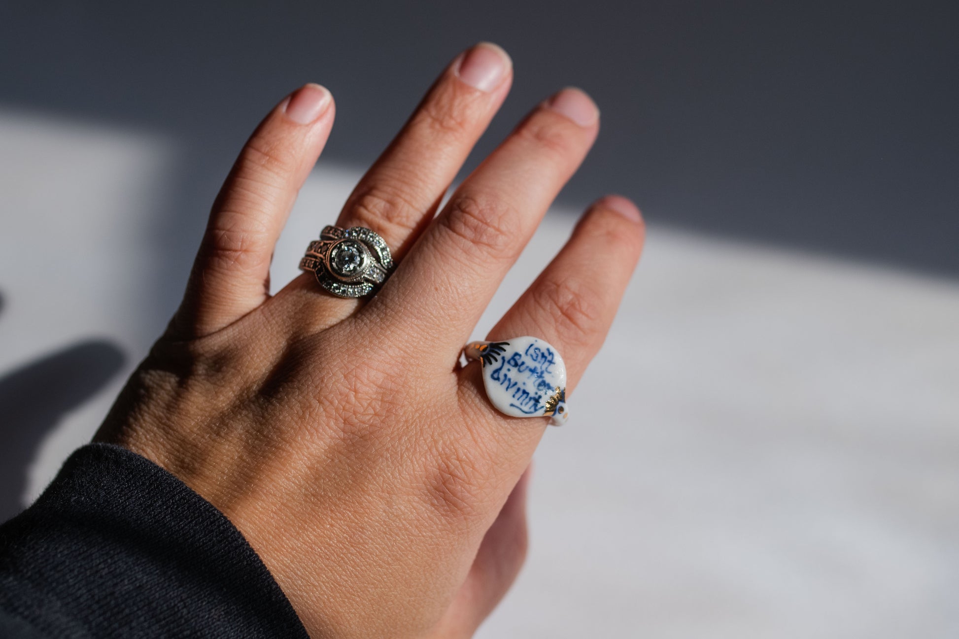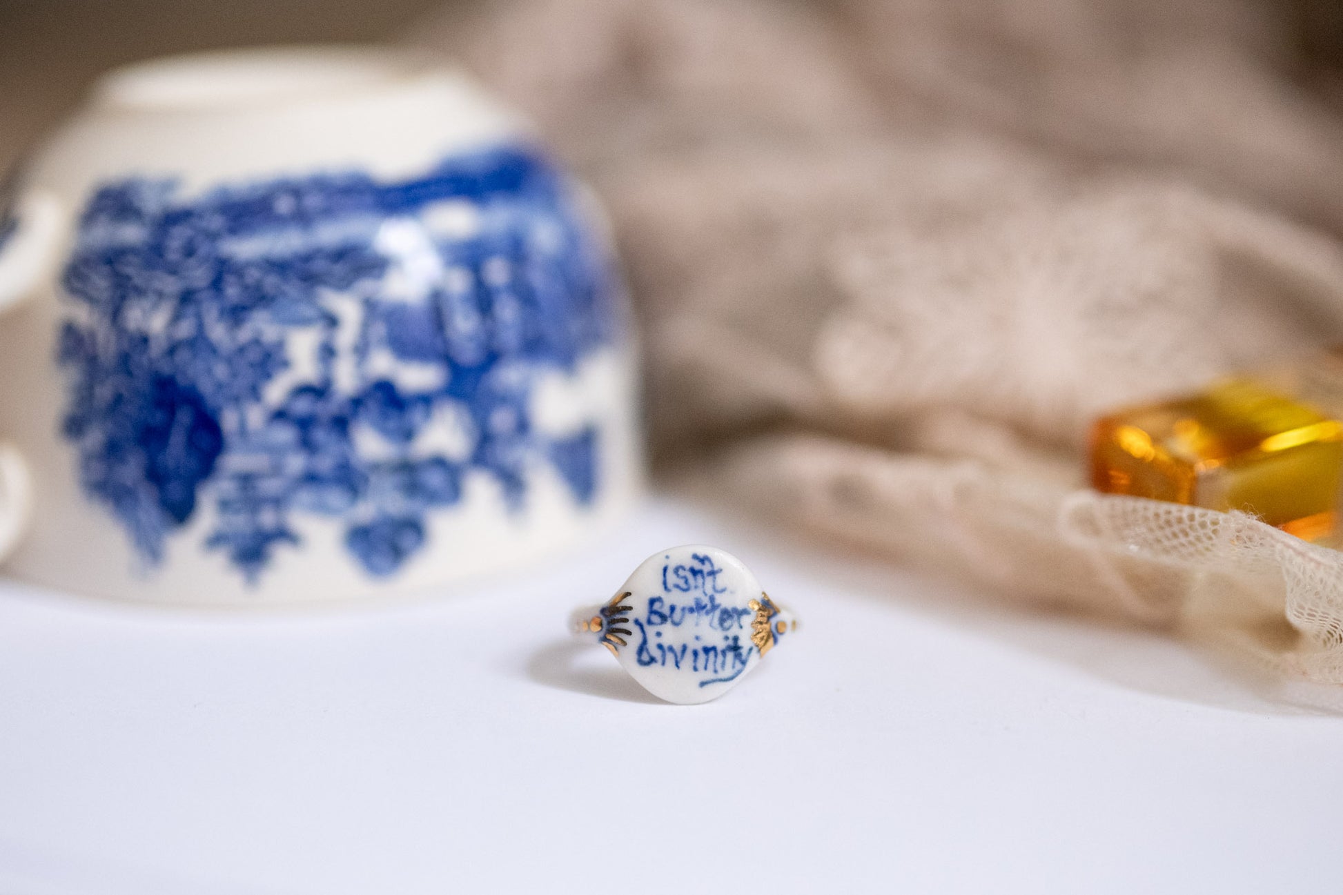 Hand-Painted blue details, hand-shaped white porcelain, twice fired